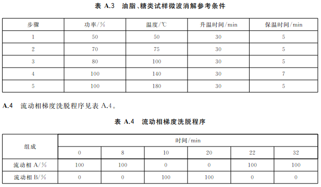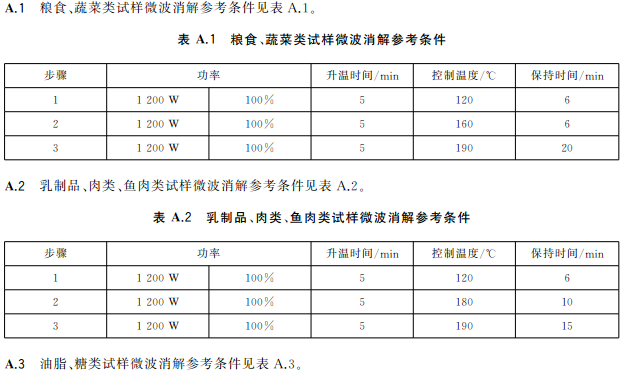蔬菜、水果等含水分高的樣品,稱取2.0g~4.0g(精確至0.001g)樣品于消解罐中,加入5mL硝酸,放置30min;糧食、肉類、魚類等樣品,稱取0.2g~0.5g(精確至0.001g)樣品于消解罐中,加入5mL硝酸,放置30min,蓋好安全閥,將消解罐放入微波消解系統(tǒng)中,根據(jù)不同類型的樣品,設(shè)置適宜的微波消解程序(見表A.1~表A.3),按相關(guān)步驟進(jìn)行消解,消解完全后趕酸,將消化液轉(zhuǎn)移至25mL容量瓶或比色管中,用少量水洗滌內(nèi)罐3次,合并洗滌液并定容至刻度,混勻。同時作空白試驗(yàn)。