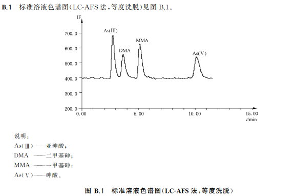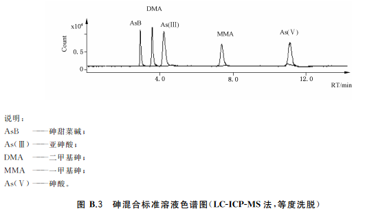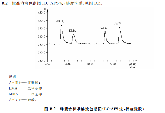 色譜柱:陰離子交換色譜柱(柱長250mm,內(nèi)徑4mm),或等效柱。陰離子交換色譜保護(hù)柱(柱長10mm,內(nèi)徑4mm),或等效柱流動相組成a)等度洗脫流動相:15mmol/L磷酸二氫銨溶液(pH6.0),流動相洗脫方式等度洗脫。流動相流速:1.0mL/min;進(jìn)樣體積:100!L。等度洗脫適用于稻米及稻米加工食品b)梯度洗脫:流動相A:1mmol/L磷酸二氫銨溶液(pH9.0);流動相B:20mmol/L磷酸二氫銨溶液(pH8.0)。(梯度洗脫程序見附錄A中的表A.4。)流動相流速:1.0mL/min;進(jìn)樣體積100μL。梯度洗脫適用于水產(chǎn)動物樣品、含水產(chǎn)動物組成的樣品、含藻類等海產(chǎn)植物的樣品以及嬰。