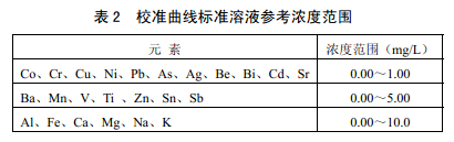 基于顆粒物樣品實(shí)際化學(xué)組成,表2 給出了標(biāo)準(zhǔn)溶液濃度參考范圍。建議在此范圍內(nèi)除 標(biāo)準(zhǔn)系列空白溶液(5.9),依次加入多元素標(biāo)準(zhǔn)儲(chǔ)備液(5.13 )配制3 ~5個(gè)濃度水平的標(biāo)準(zhǔn)系列。各濃度點(diǎn)用硝酸溶液(5.9)定容至50.0 ml。可根據(jù)實(shí)際樣品中待測(cè)元素濃度情況調(diào) 整校準(zhǔn)曲線濃度范圍。