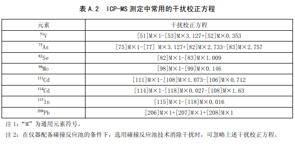 A.1給出了ICP-MS測定中常見的多原子離子干擾,表A.2給出了常用的干擾校正方程。
