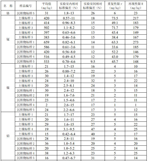 11.3 每批次樣品至少按10%的比例進行平行雙樣測定,樣品數量少于10個時,應至少測定一個平行雙樣。平行雙樣測定結果中,電熱板消解測定鈷(Co)、銅(Cu)、鉻(Cr)、錳(Mn)、鎳(Ni)、鉛(Pb)、鋅(Zn)、釩(V)、砷(As)的相對偏差應小于30%,鎘(Cd)、鉬(Mo)、銻(Sb)的相對偏差應小于40%;微波消解測定12種金屬元素的相對偏差應小于30%。