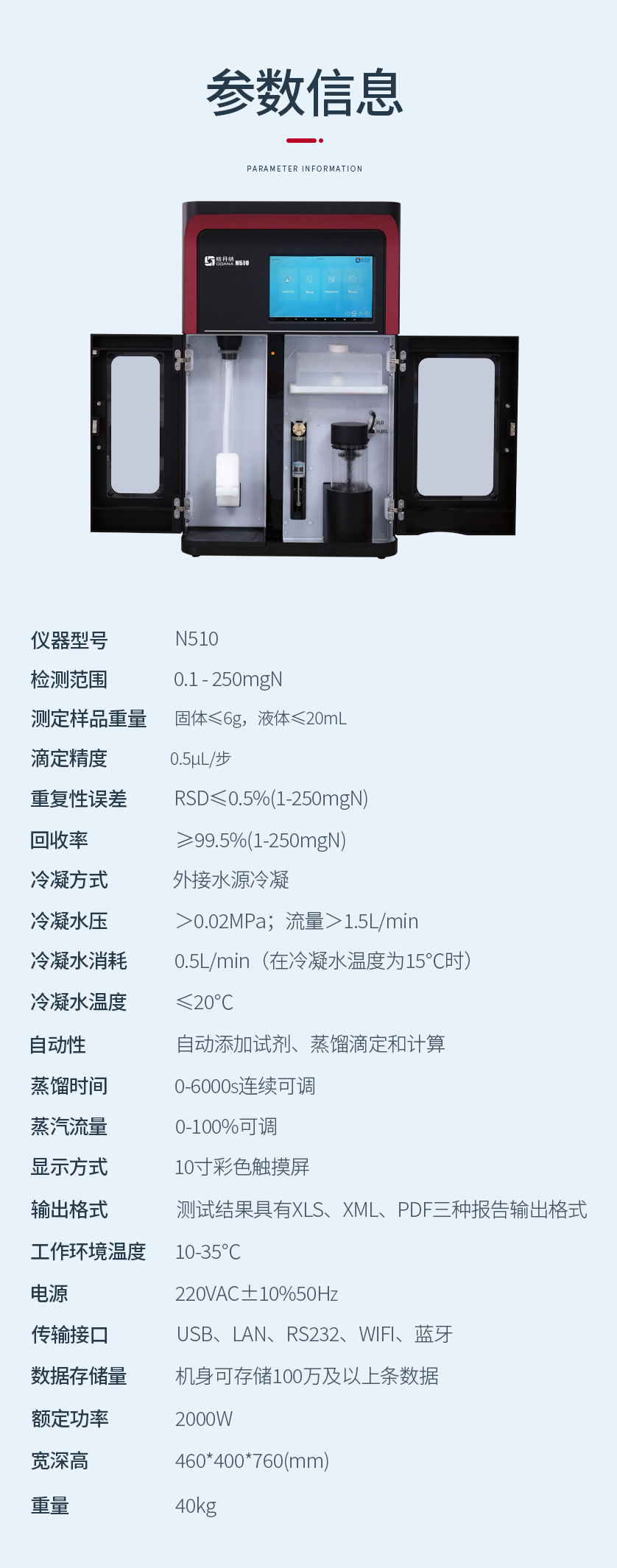 全自動加堿加酸加稀釋劑、全自動蒸餾滴定、全自動清洗、全自動消化管排空、全自動溶液液位監(jiān)測、全自動超溫監(jiān)測、全自動排廢、全自動計算結(jié)果、輸出、打印。